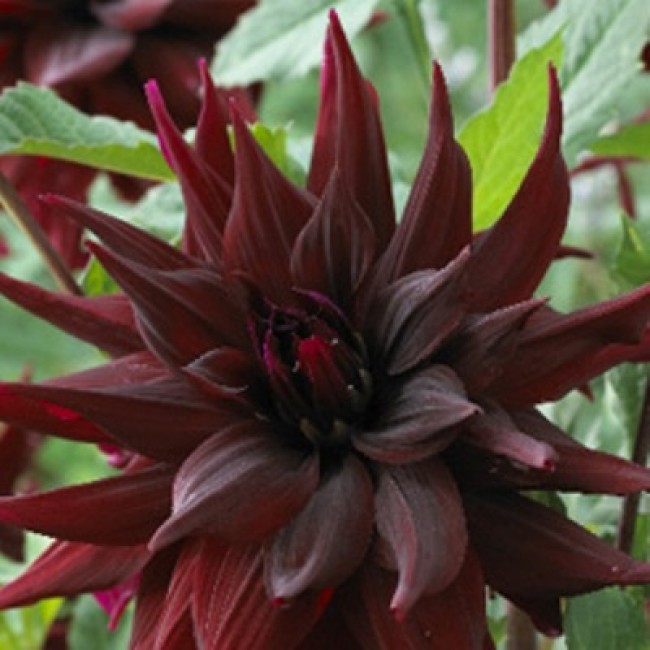 Георгина Декоративная Бригитта Алида- цвет темно-бордовый, в центре с черным напылением. Высота 100 см. Цветение наблюдается с июля по октябрь. Глубина посадки 5-7 см над клубнем. Расстояние между растениями в ряду — 25–30 см. После посадки растения обильно поливают.