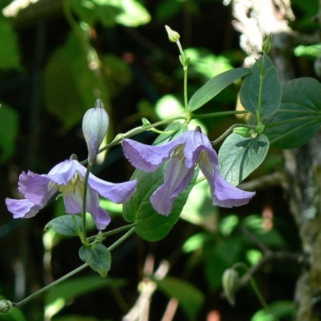 Клематис ботанический Ханна - красивая среднерослая лиана. Летом покрыта массой цветков: колокольчиковидных, слегка свешивающихся, со светло-голубыми лепестками, со светлой, лилово-розовой полоской снаружи и красиво сочетающимися жёлтыми тычинками. Здоровый нетребовательный сорт. Довольствуется средними почвами.