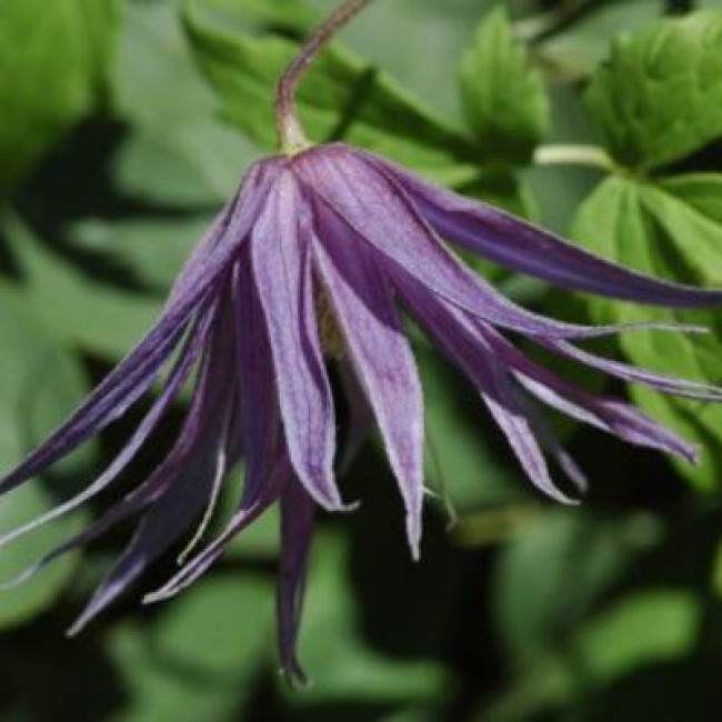 Клематис ботанический Пёпл Спайдер - сорт с интересными цветками: тёмно-фиолетовыми (почти чёрными), полумахровыми, колокольчиковидными, свешивающимися. Летом частично повторяет цветение. Летом и осенью покрыт декоративными соплодиями. Очень устойчив и нетребователен. Цепляется за опоры листовыми черешками. Идеально подходит для выращивания у ограждений, камней и старых пней, а также небольших деревьев или кустарников.