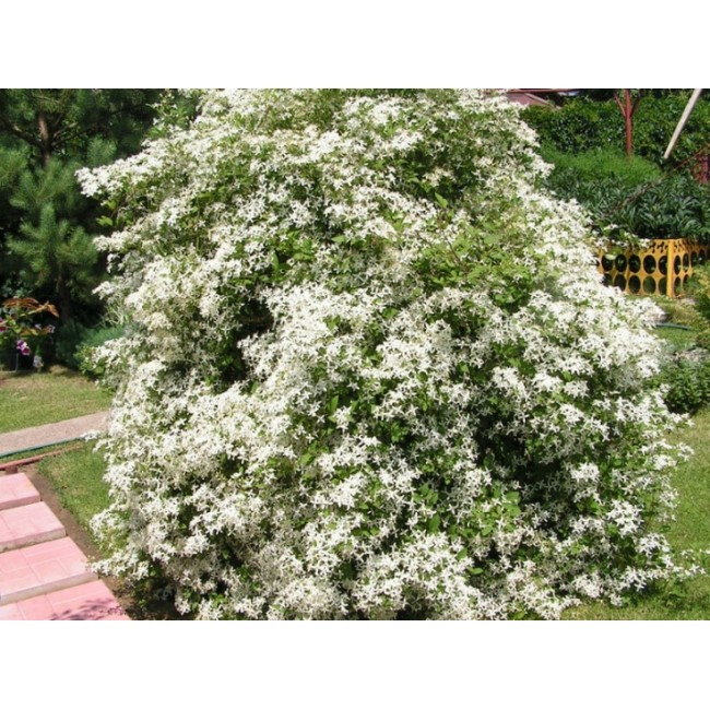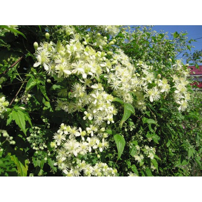 Клематис виноградолистный - представляет собой полукустарниковую лиану, которая поднимается на опоре на высоту 5-12 (30) м. Растет быстро. Стебли сильно ребристые, лазящие, многолетние. За опору цепляется с помощью длинных черешков листьев, которые завиваются. Кора трещиноватая, серо-бурая, бороздчатая. Молодые побеги зеленовато-коричневого цвета, шестигранные. Цветки многочисленные, обоеполые, 1-2 см в диаметре, тусло-белые с зеленоватым оттенком или белые, с легким приятным ароматом миндаля, слабо поникающие, собраны в пазушных или верхушечных метельчатых соцветиях, растут на прямостоячих цветоносах до 10 см в длину. Цветет обильно, на побегах текущего года, июле-сентябре.